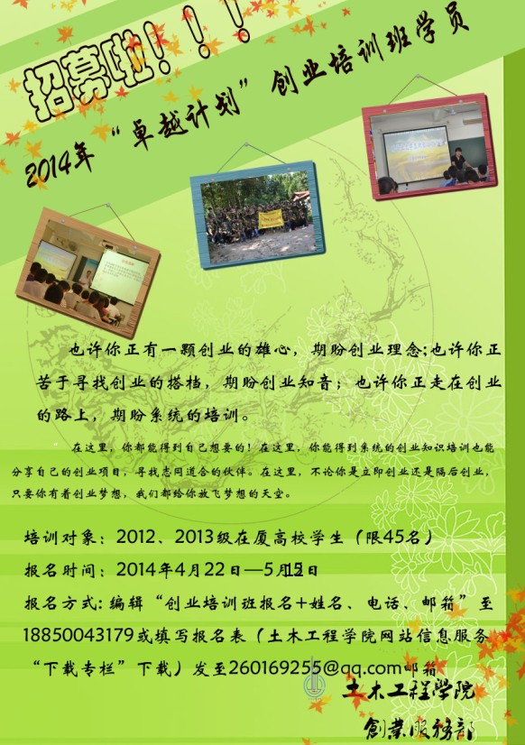 2014年“卓越计划”创业培训班学员招募,招募对象2012、2013级学生,报名时间截止至5月12日,短信报名,发送内容“创业培训班报名+姓名+电话+邮箱”报名电话:18850043179,报名表电子邮箱投递:[email protected]。(报名表电子版已上传班长支书群)