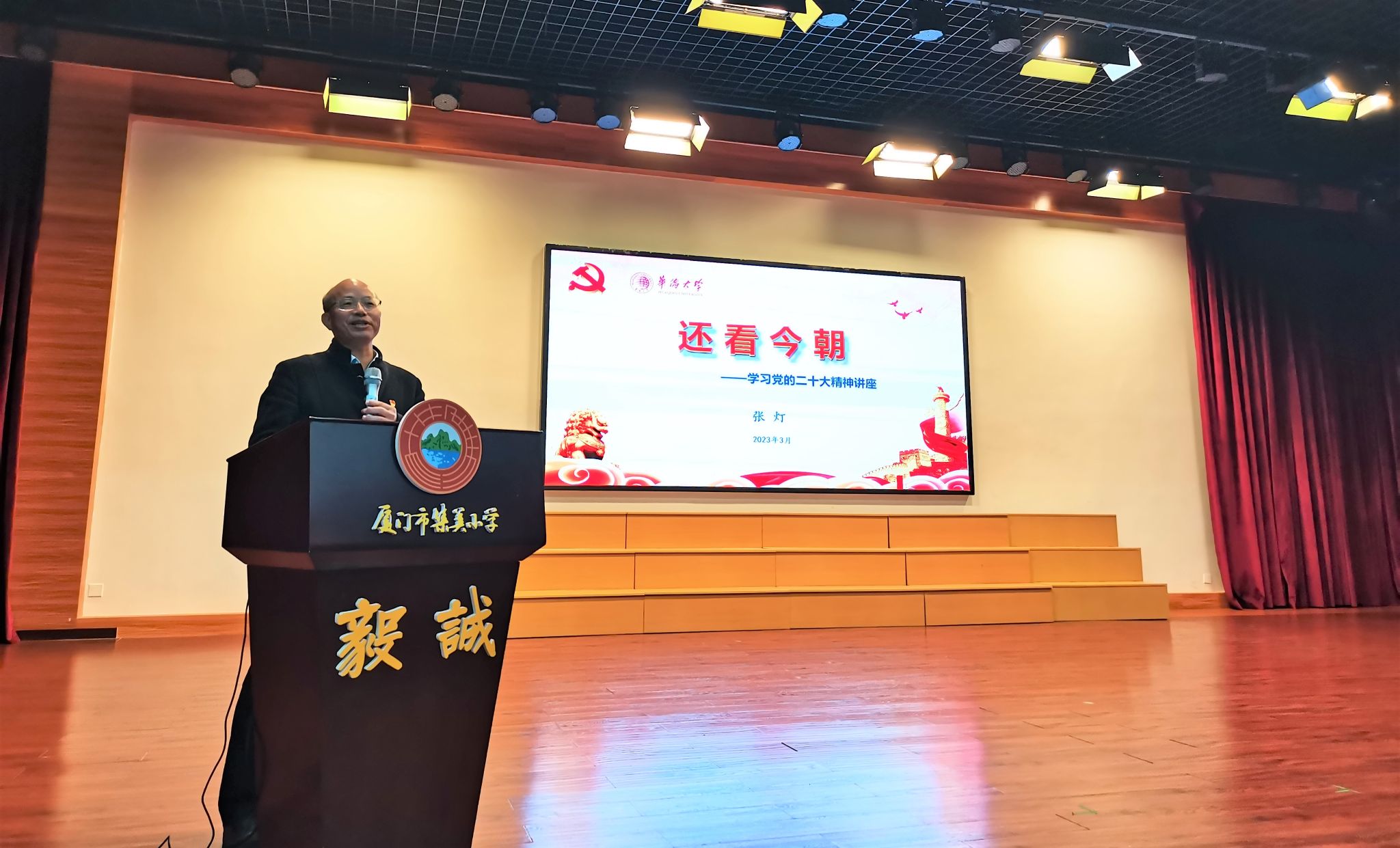 党委书记张灯应邀为厦门市集美小学全体教师讲授《还看今朝——学精神 强思想 促发展》学习党的二十大精神专题党课,土木工程系教工党支部、建筑结构抗火与防灾减灾创新团队党支部党员教师代表出席,集美小学党支部书记、校长陈志良等校领导及中层干部出席。