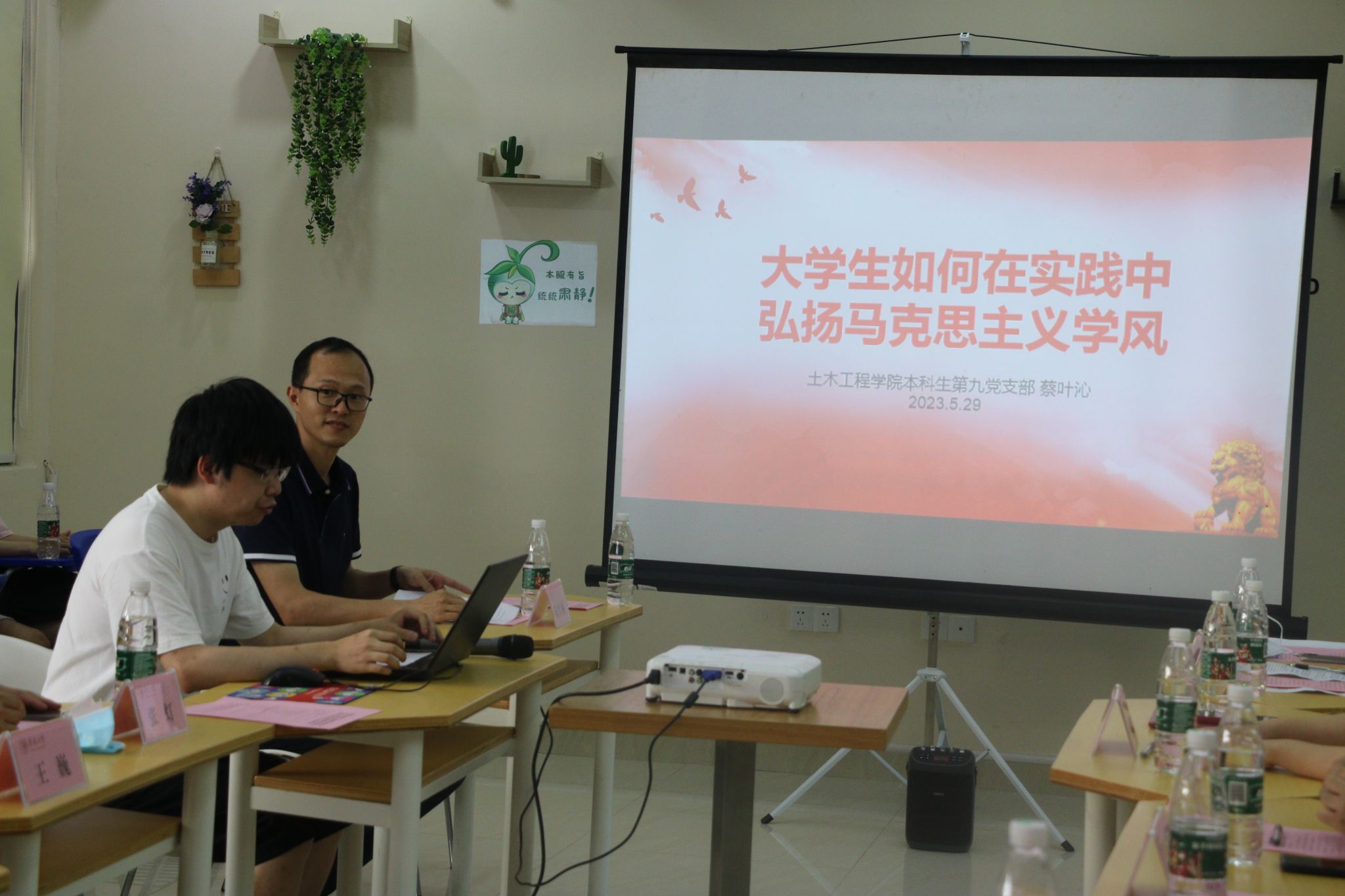 本科生第九党支部党员蔡叶沁同学,学生社区梅苑A栋学生楼栋党支部党员闫龙龙同学,分别以《大学生如何在实践中弘扬马克思主义学风》、《扎实推动主题教育 激发基层党组织新动能》主题进行了分享交流。