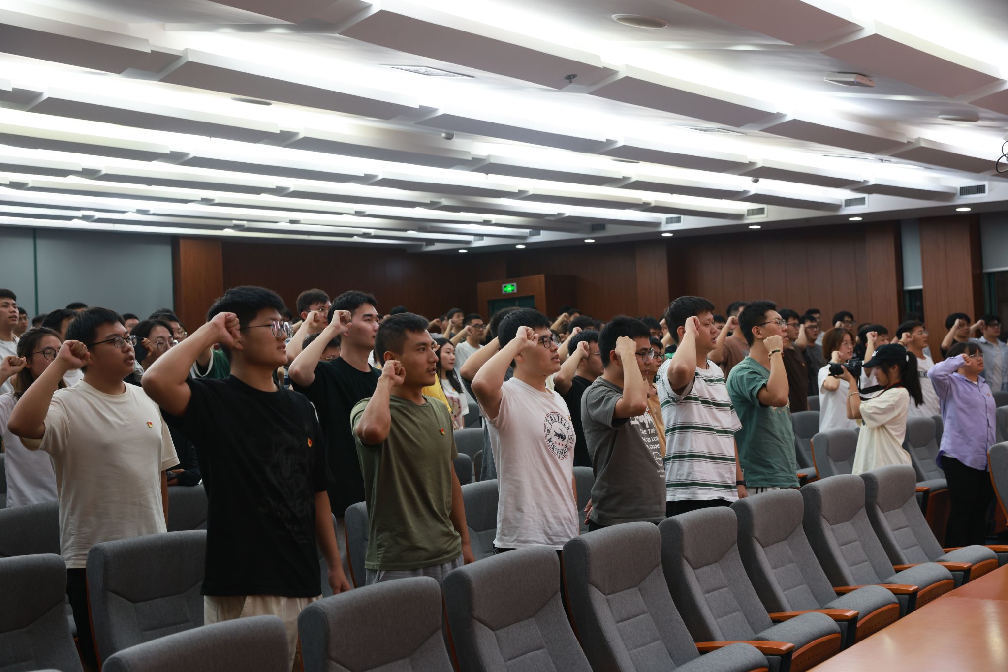 最后,全体学生党员面向党旗,高举右手,重温入党誓词,庄严宣誓——“我志愿加入中国共产党,拥护党的纲领,遵守党的章程……为共产主义奋斗终身,随时准备为党和人民牺牲一切,永不叛党!”