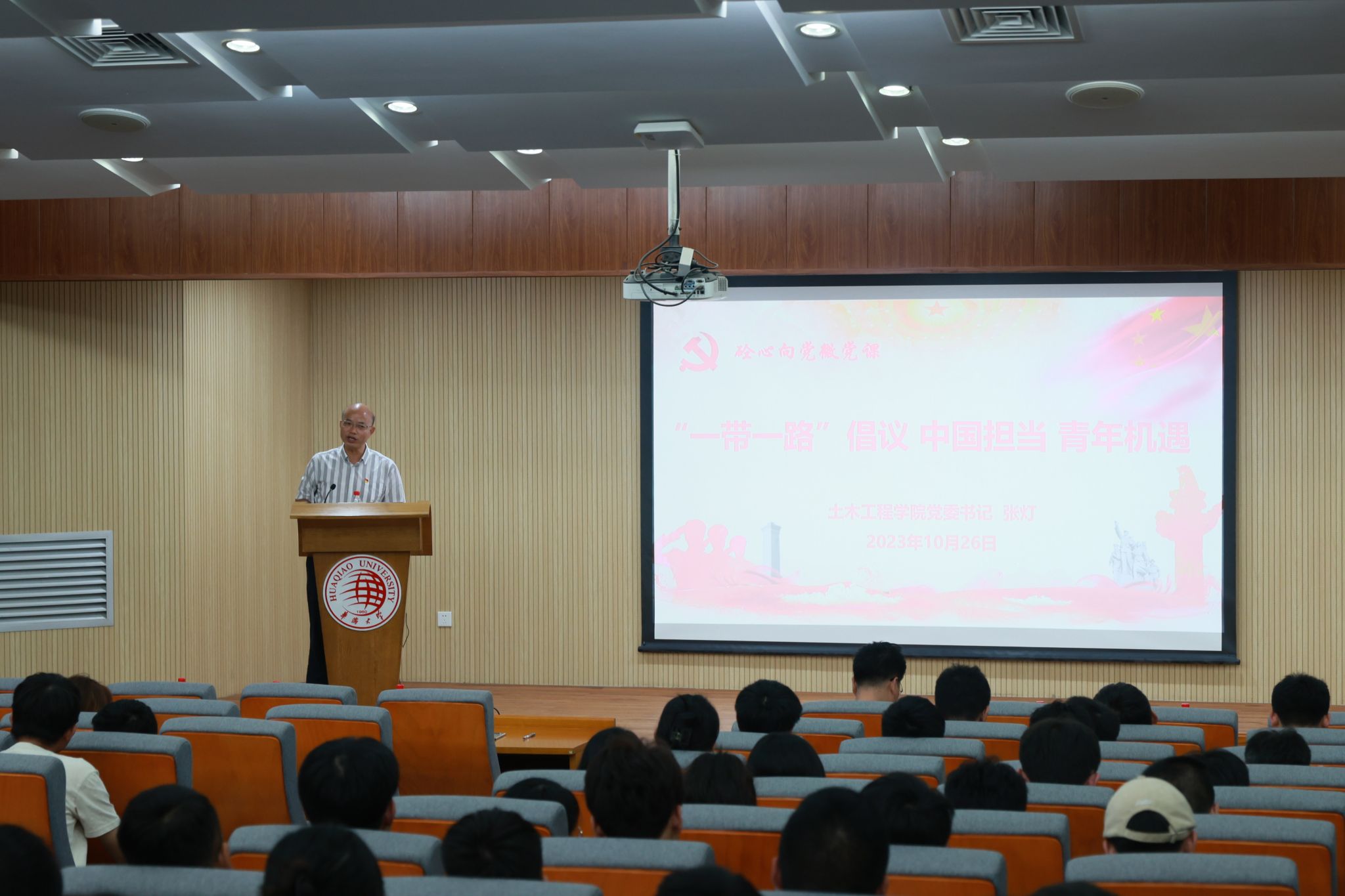 张灯从共产党员的初心和使命为切入点,讲述了“一带一路”倡议和共商、共建、共享理念下青年学子特别是土木青年学子的机遇和担当。张灯指出,广大青年学生身上肩负着责任和使命,要放眼世界,扩展国际视野,将自身的远大抱负和爱国情怀与学院、学校和国家的发展结合起来,运用到“一带一路”伟大实践中去。