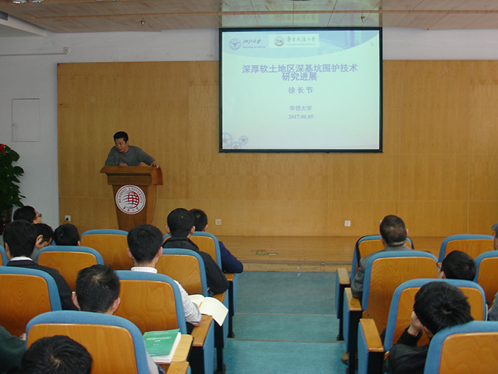 岩土与地下工程系系主任陈士海教授主持。徐长节从考虑坑边荷载和挖深的非平衡式基坑、长短桩设计方法及工法、坑边作用交通荷载等几个方面,介绍了其课题组在深基坑围护研究创新与实践的最新研究进展。报告会上,徐长节教授还与在座师生就长短桩围护结构的模拟计算等问题进行了热烈的讨论。